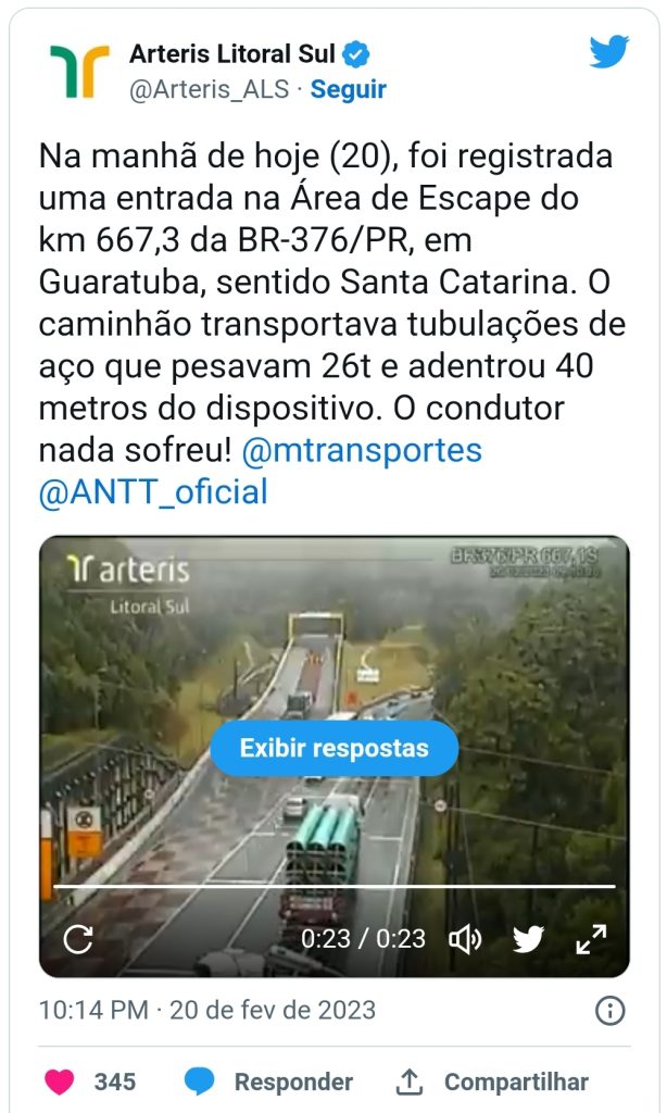 Um caminhão, que estava carregado com 26 toneladas de tubo de aço, usou a área de escape da BR-376, em Guaratuba, Litoral do Paraná, na manhã da segunda-feira (20).