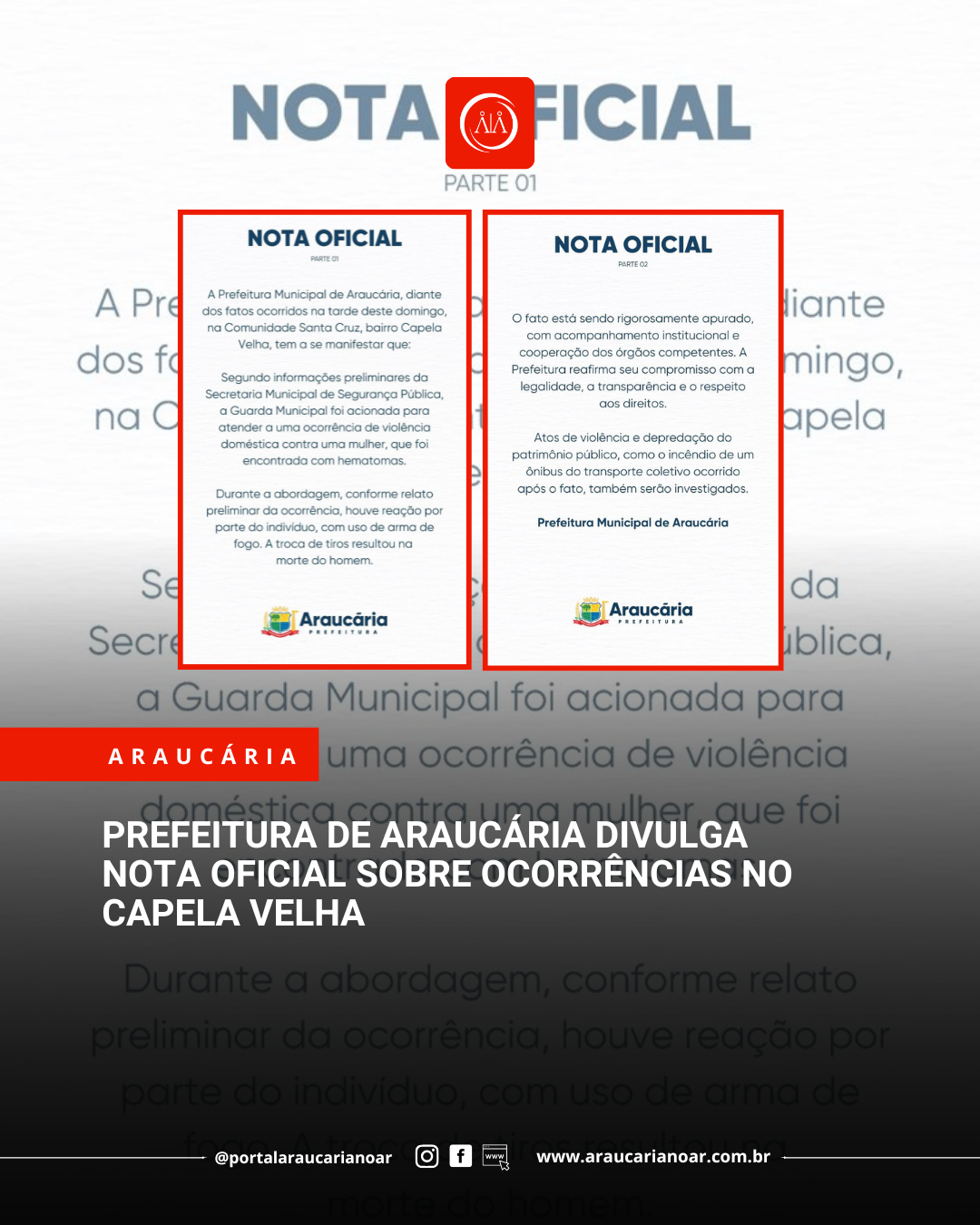 Prefeitura de Araucária divulga nota oficial sobre ocorrências no Capela Velha