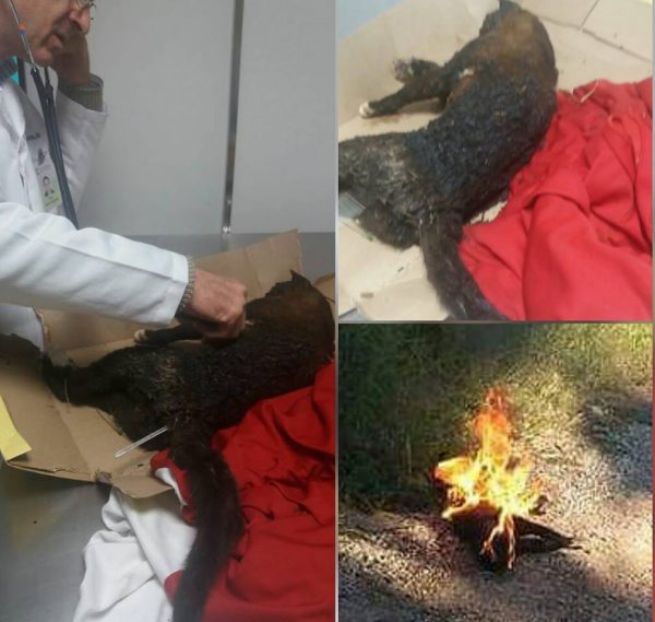 “O animal agonizava. Nós o recolhemos mesmo sem poder. Ele foi socorrido ao Garra Hospital Veterinário e internado em tratamento intensivo imediatamente. O gatinho estava com muita dor e cansado. O dr Elgio João Presotto nos atendeu brilhantemente como sempre, visivelmente abalado, pelo cheiro de queimado misturado com querosene e nossas lágrimas”, diz o relato do grupo Força Animal na sua página no Facebook.