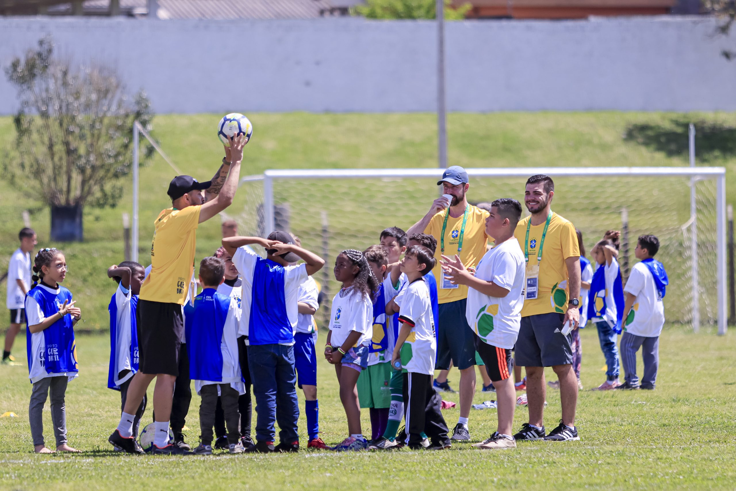 #PraTodosVerem: A imagem mostra um grupo de crianças, meninos e meninas, observando as orientações de um dos instrutores do projeto. O instrutor aparece na foto levantando uma bola de futebol com as mãos. As crianças usam uniforme do projeto, nas cores azul e branco. Os instrutores usam camiseta amarela com a marca da CBF no peito.