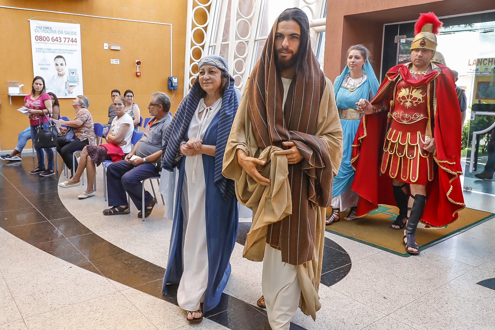 Devidamente caracterizados com os trajes dos personagens do espetáculo “Vida, Paixão e Morte de Cristo”, atores do Grupo Lanteri visitaram o Hospital Municipal de Araucária (HMA) na tarde desta segunda-feira (15) onde se encontraram com pacientes, familiares dos pacientes e funcionários da instituição. Foi um momento de muita emoção para vários dos visitados. A apresentação da Paixão de Cristo será no dia 19 de abril, às 19 horas, no Parque Cachoeira e tem entrada gratuita. A encenação do Grupo Lanteri, que ocorrerá pelo 2º ano consecutivo em Araucária, é a segunda maior, ao ar livre, do Brasil, ficando atrás apenas da Nova Jerusalém, em Pernambuco.