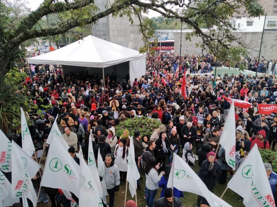 Os servidores estaduais fazem nesta terça-feira (9) uma grande mobilização no Centro Cívico, em Curitiba, para pressionar o Governo do Paraná. Eles rejeitaram a proposta de 5,09% em quatro parcelas até 2022 e se organizam em novo protesto. No começo desta manhã, caravanas do interior, com professores, funcionários de escolas e servidores se concentraram na Praça 19 de Dezembro e seguiram em caminhada até a Praça Nossa Senhora da Salete, em frente ao Palácio Iguaçu.