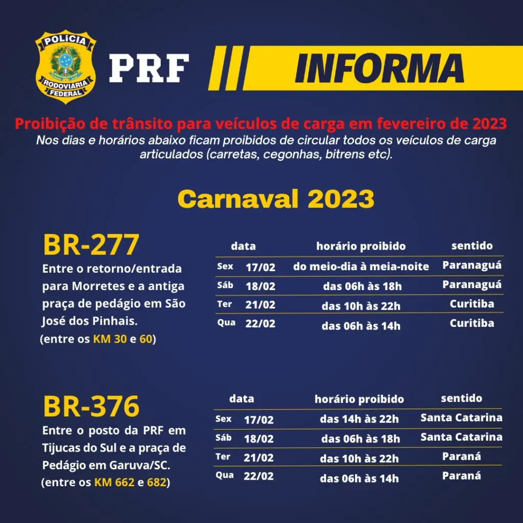 Com a proximidade do feriado de carnaval e a continuidade das obras nas BRs 376 e 277, com a consequente formação de longas filas pela indisponibilidade da capacidade total de tráfego das rodovias, a Polícia Rodoviária Federal (PRF) vai estender a restrição de circulação de veículos pesados no trecho entre Curitiba e Paranaguá (BR-277) e entre os estados do Paraná e Santa Catarina (BR-376) durante a Operação Carnaval 2023. A restrição acontecerá entre sexta-feira (17) e quarta-feira (22), com exceção de domingo (19) e segunda-feira (20).