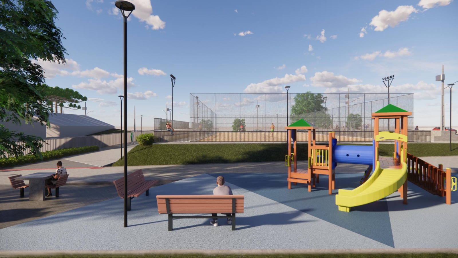 #pracegover: A primeira imagem mostra uma projeção aérea de foco ficará a distribuição dos espaços após as melhorias na praça. Vale destacar o desenho dos caminhos de pedestres, a projeção da quadra de areia e a proposta de paisagismo. A segunda imagem mostra, com destaque, a projeção para o parquinho infantil e, ao fundo dele, a quadra de areia.