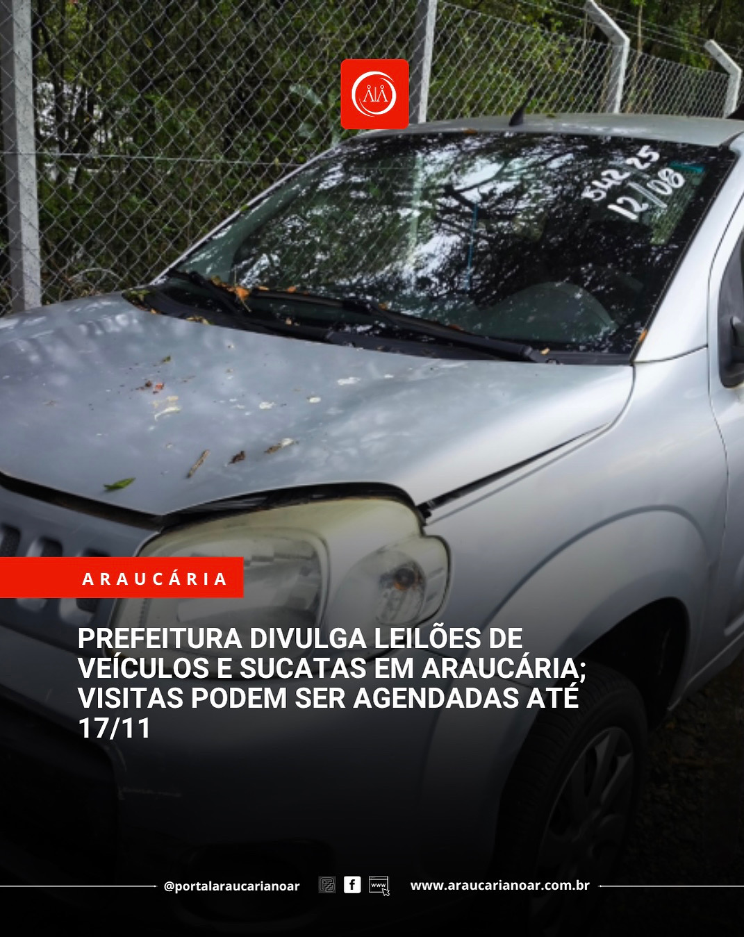 A Prefeitura de Araucária, por meio da Secretaria de Urbanismo (SMUR), divulgou os editais para dois leilões de veículos: um com veículos em condições de circulação, previsto para 26 de novembro, e outro com sucatas, marcado para 27 de novembro. Ao todo, são 40 lotes disponíveis.