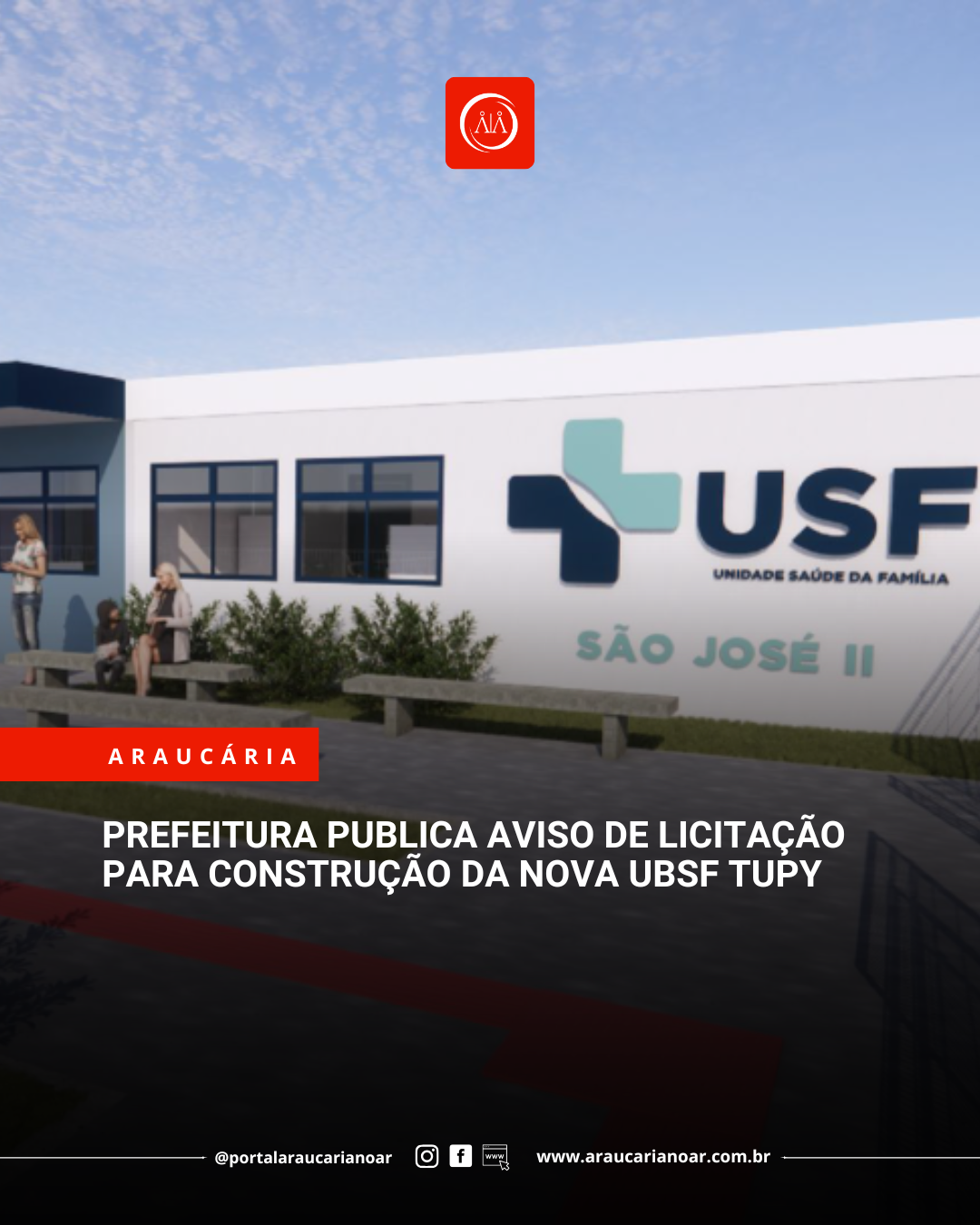 A Prefeitura de Araucária publicou, nesta quarta-feira (21), no Diário Oficial do Município, o aviso de licitação para a construção da nova Unidade Básica de Saúde da Família (UBSF) São José, conhecida como Posto de Saúde do Tupy, localizado na região do Campina da Barra. A concorrência eletrônica é a de nº 01/2026 e integra o Processo de Licitação nº 182.406/2025.