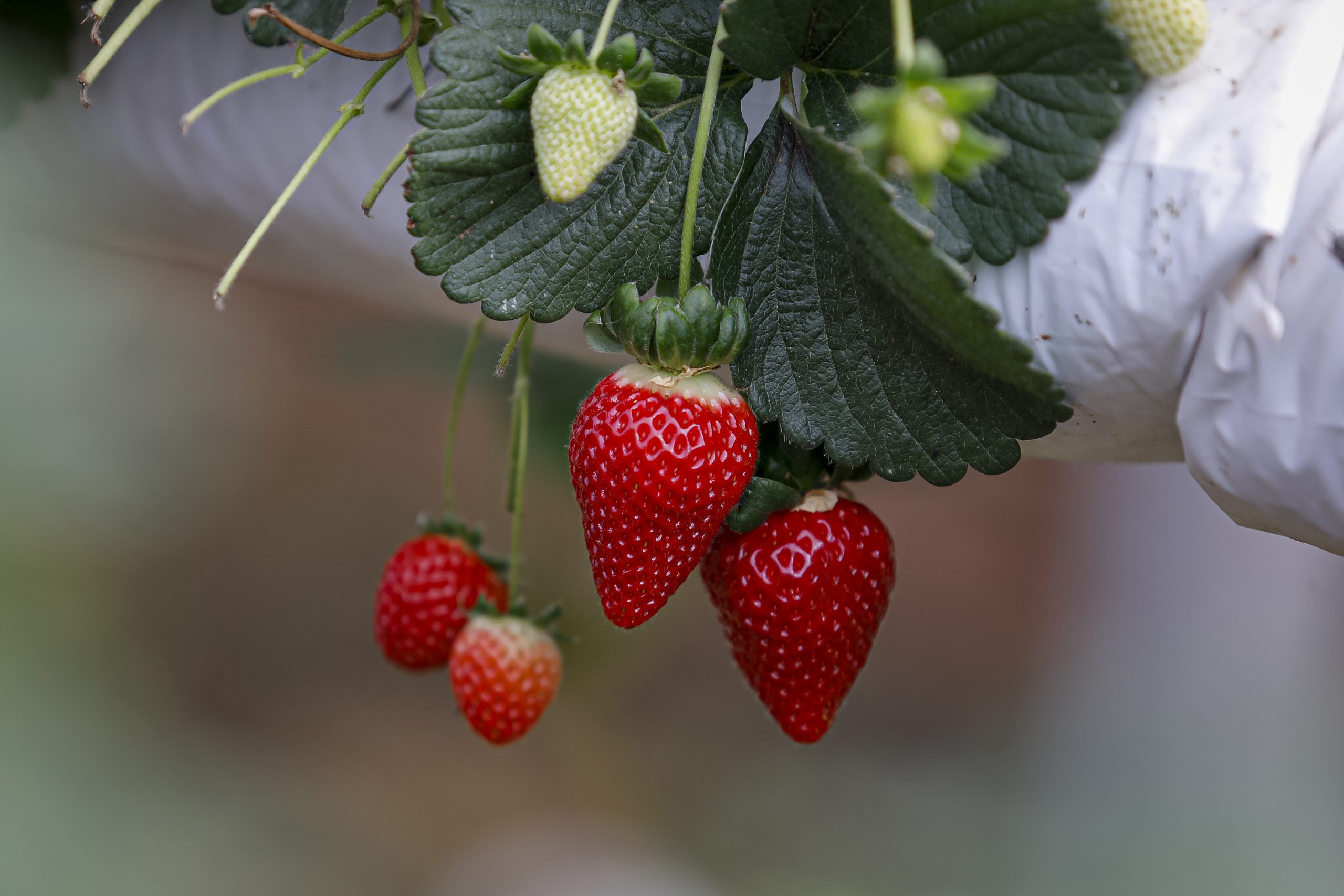 #Pracegover: A imagem relacionada a esta notícia mostra um pé de morango com várias frutas maduras e bem vermelhas. O fundo está desfocado, porém mostra um pedacinho da estufa no qual está plantado.