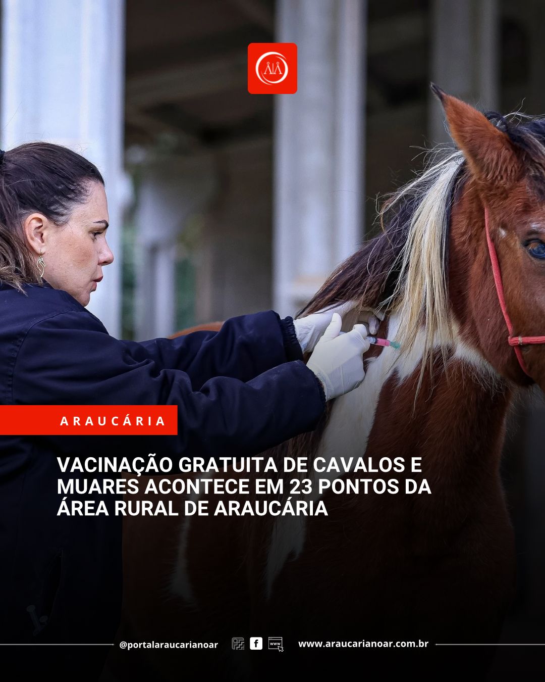A Prefeitura de Araucária, por meio da Secretaria Municipal de Agricultura (SMAG), promove entre os dias 06 e 08 de outubro uma campanha de vacinação gratuita destinada a cavalos, mulas e burros. O município é o único da região a oferecer, sem custos, a imunização contra raiva, encefalomielite e tétano três doenças graves que podem afetar tanto os animais quanto os seres humanos.