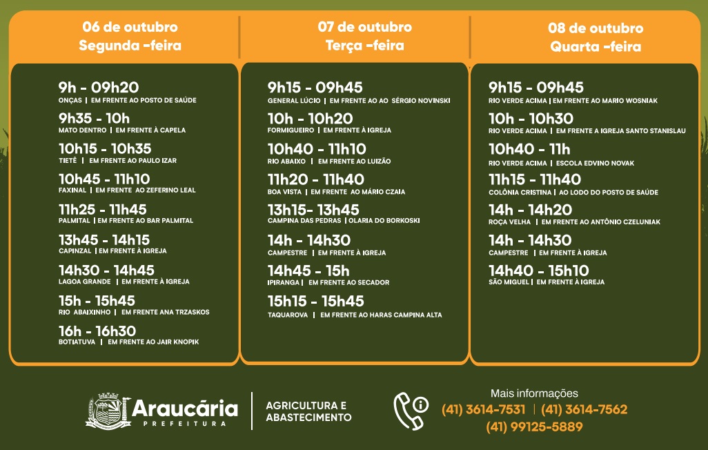 No total, serão 23 pontos de vacinação distribuídos pela zona rural, cada um com dia e horário definidos. Para vacinar, basta que o criador leve seu animal até o ponto mais próximo, conforme a programação. Importante reforçar que a vacina não será entregue para aplicação em outro momento ou local.