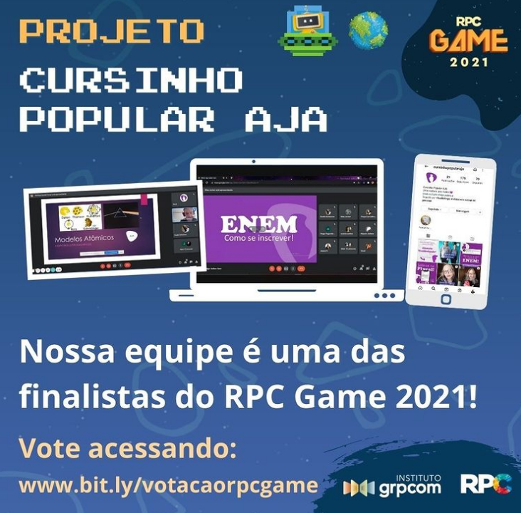 O Cursinho Popular AJA, que atende estudantes de baixa renda em Araucária, é finalista do RPC Game 2021, concurso realizado pela RPC TV e Instituto GRPCOM que premia e da visibilidade à iniciativas de jovens paranaenses. A equipe do projeto é formada, em sua maioria, por jovens universitários que foram alunos de cursinhos populares e, hoje em dia, retribuem esse auxílio ajudando outros jovens a buscarem uma vaga na universidade pública. No entanto, para levarem o prêmio para casa precisam do seu voto. Para ajudar o AJA ganhar essa competição basta clicar aqui e votar quantas vezes quiser, pois não há limite de voto por pessoa.